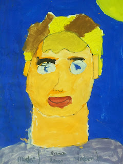 We were using the Biggie Tempera cakes for the first time. I had them mix colors right on the paper or on the lids to the trays. Last year I had jars of tempera in boxes on the tables and the kids used popscicle sticks to dole out paint onto a palette and mix. But distribution was such a hassle, and many kids spent more time mixing colors than actually painting. Or they wouldn't ever mix enough. I think the Biggie Tempera was much easier to distribute and use, although the mixing issue was still a slight problem, and many kids were too impatient to let things dry before painting next to an area, and they had colors bleed. It shared issues normally seen in watercolor painting. Overall, the portraits look slightly sloppy, but perhaps I'm just putting adult aesthetics inappropriately on viewing kid paintings... The ones I'm sharing here now are the best from each class. I do have some very careful painters. I wonder how the 4th graders would compare...